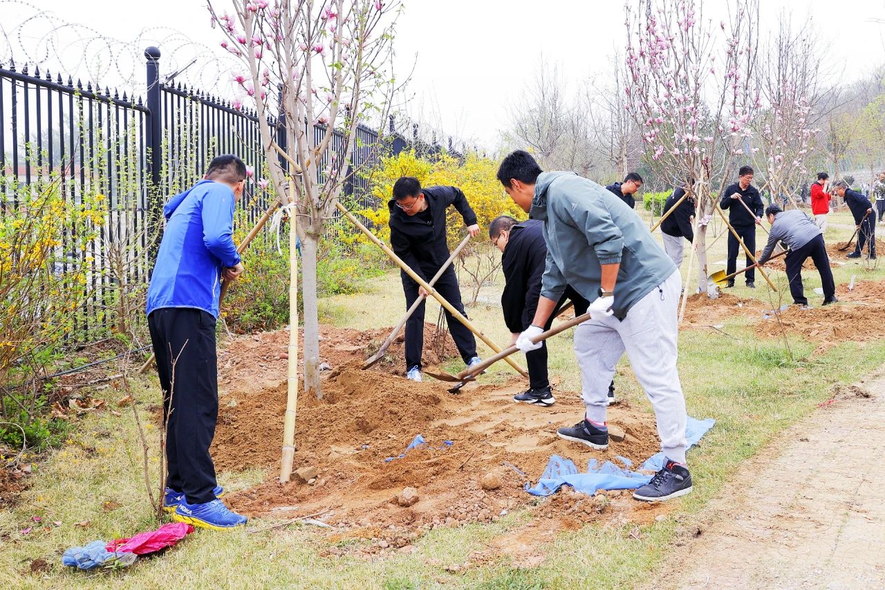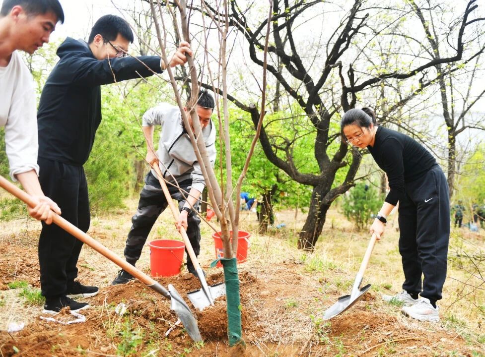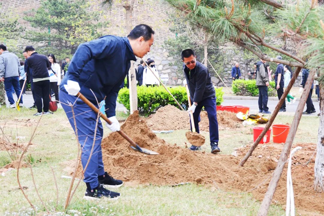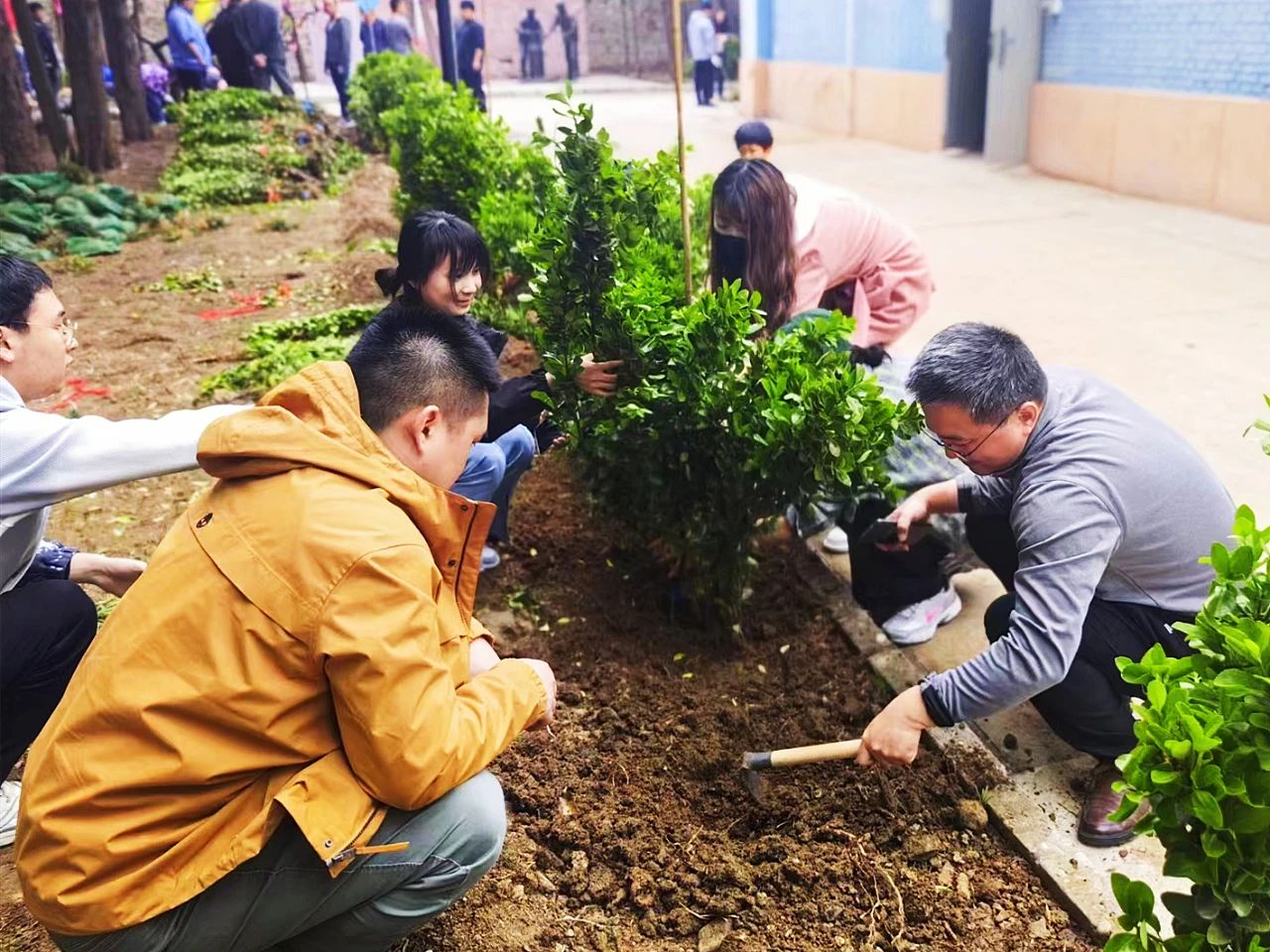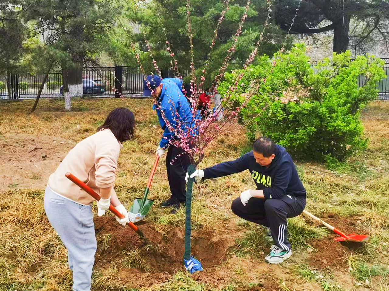 植树现场春意盎然、人头攒动,一派热火朝天的劳动景象。大家挥锹铲土,培土围堰,提桶浇水,种下元宝枫、油松、玉兰、树桩月季及连翘等树苗。在和煦的春风中,一株株新植树苗错落有致、生机勃勃。