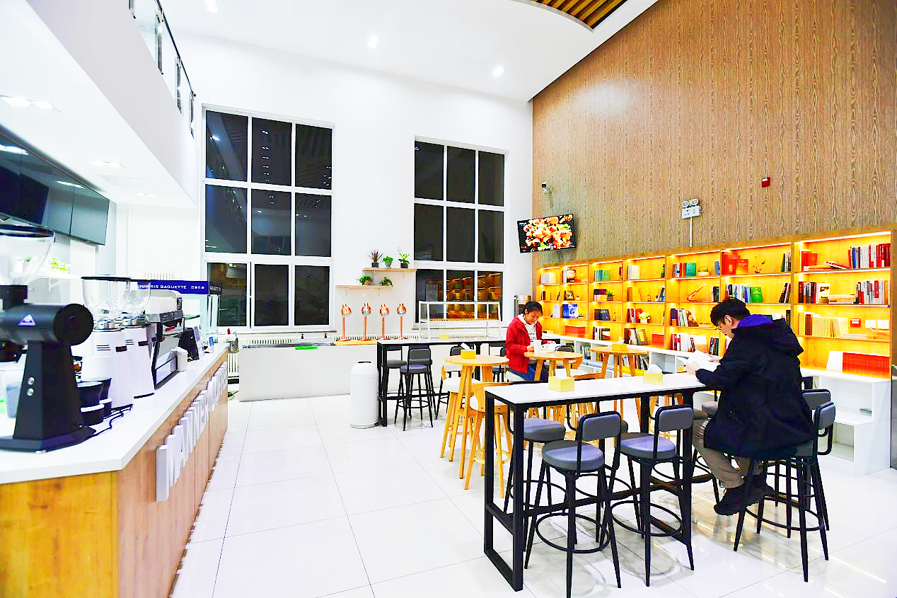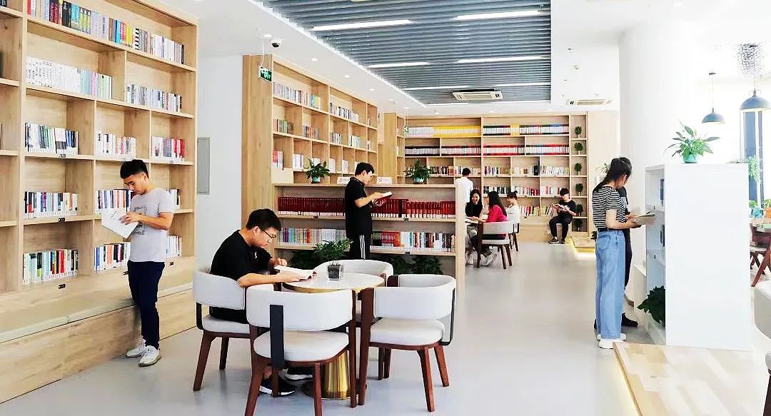 试验基地职工书屋占地140多平方米,布置温馨舒适。职工书屋利用书架做隔断,一边是书吧,一边是咖啡吧。书屋墙面印有“胸藏文墨怀若谷,腹有诗书气自华”等标语赫然醒目,书架上的5000多本各类图书整齐排放,涵盖了文学、历史、艺术、科技等多个领域,可以满足职工多样化的阅读需求。咖啡吧里安装有灰色的布艺沙发和原木圆桌,桌上的绿植生机勃勃,让整个空间充满氛围感。
