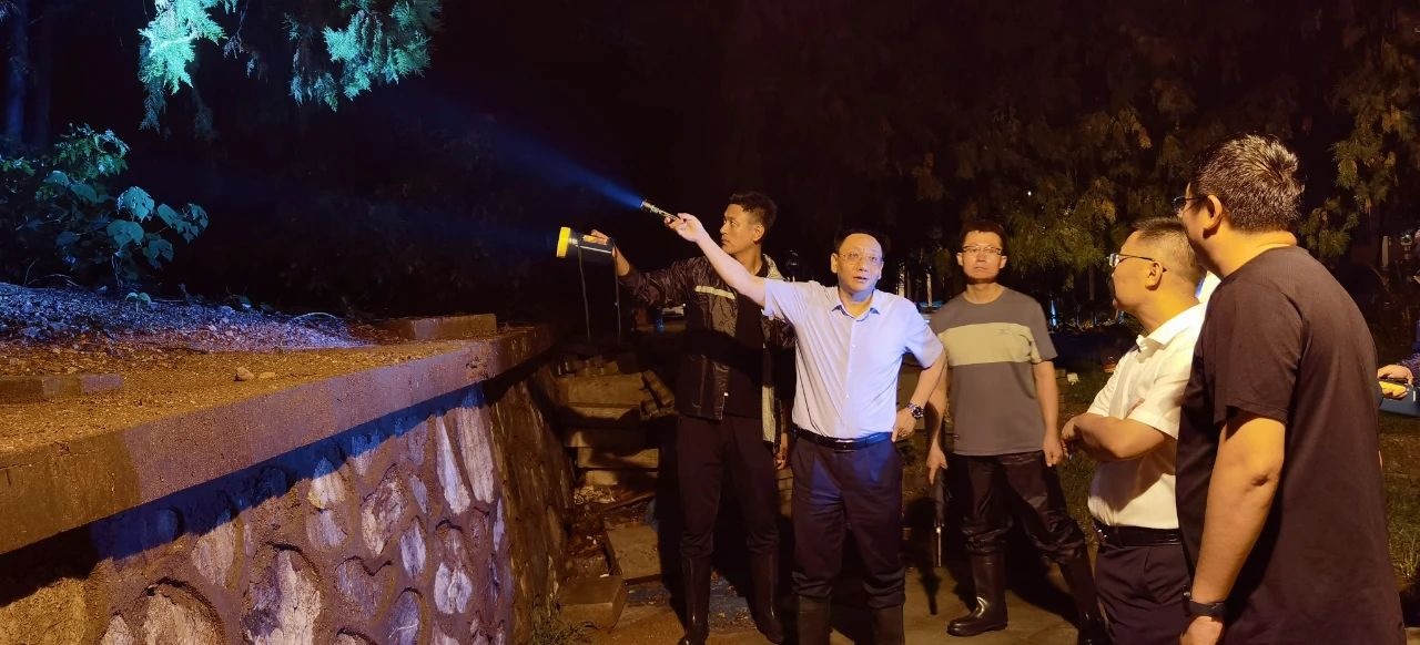 午夜时分,三院党委书记施毅、副院长王继星带领防汛应急小组成员奔赴云岗工业区和重点防汛区域,巡查汛情,查勘风险。