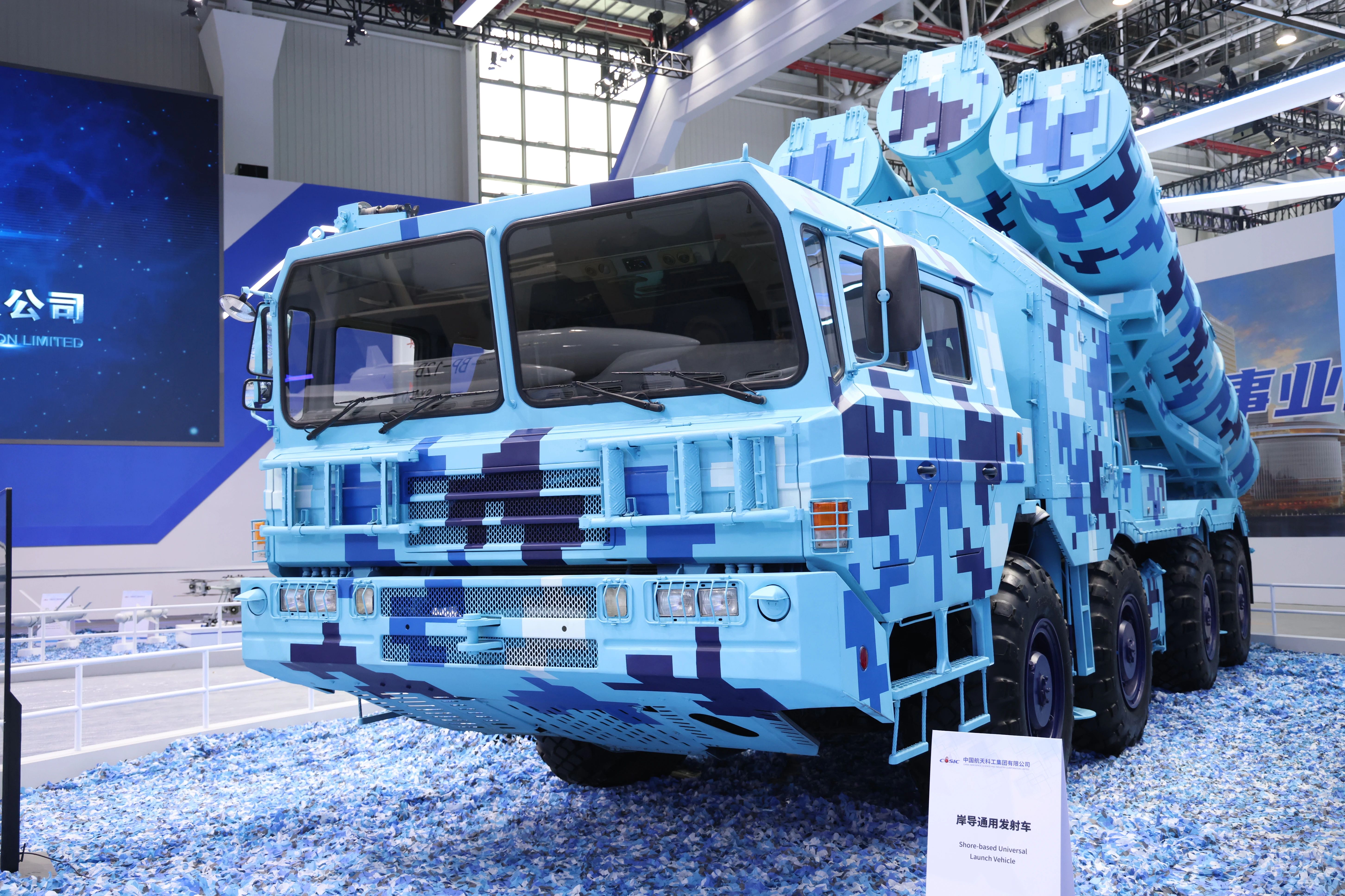 岸导通用发射车可作为YJ-12E、CM-802B、CM-103等各型岸舰导弹的发射平台,具有良好的机动性及越野性能。集装箱发射单元采用标准集装箱隐蔽外形,可灵活布置在舰船、拖车、野外固定阵地等多种场地,具有隐蔽性强、通用化程度高、部署灵活等特点,可有效补充现有平台作战能力。