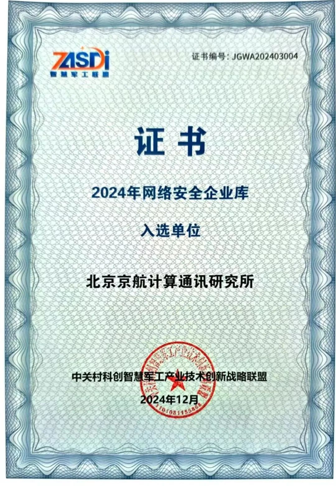 近日,304所入选中关村科创智慧军工产业技术创新战略联盟发布的“2024年网络安全企业库”。