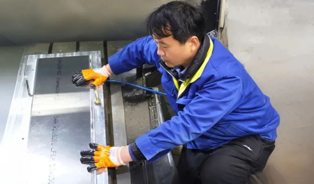 “千淘万漉虽辛苦,吹尽狂沙始到金。” 车间里,一批新的加工任务摆在大设备组面前——生产零件“角筋”,其加工时间短、数量大、工件变形率高,稍有偏差便会影响后续箱体整体质量。起初,班组内购买了一款价格不菲的薄膜式真空吸盘,本以为能大幅提高效率,但仅仅几十件后,薄膜磨损,吸力骤降。经过了解,市面上的产品并不能解决现有的加工要求,如何打造一款既耐用又通用的固定工装,成为周师傅和大设备组必须攻克的难题。
