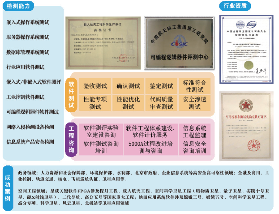 “飞航软件评测中心”成立于1998 年,是国内最早从事军用、民用、高可靠性软件评测业务的专业机构之一。获得国家及国防科技工业实验室、总装军用软件测评实验室,具备921 载人航天工程、探月工程、空间科学卫星工程软件评测机构等评测资质。自成立以来,为探月工程、载人航天工程、空间科学先导专项、某科技工程等国家重大工程,装发、总参、总装、海军、陆军、空军、火箭军、战略支援部队等军用领域,以及国家部委、地方政府、国内外知名软件企业等众多用户提供了大量优质的软件测评服务和工程化技术支持。