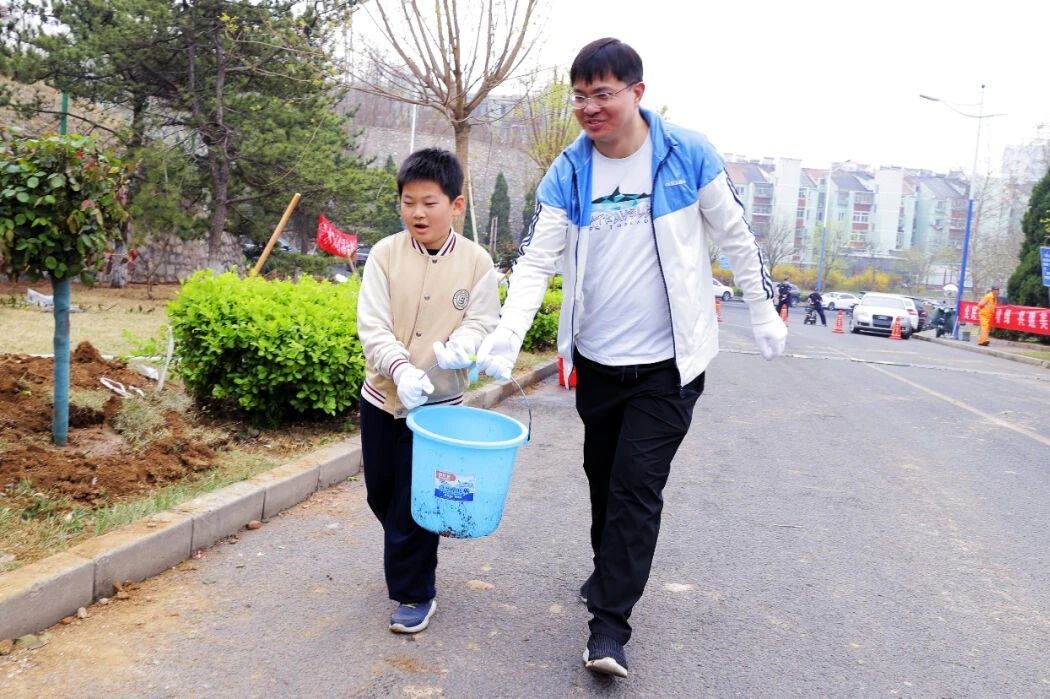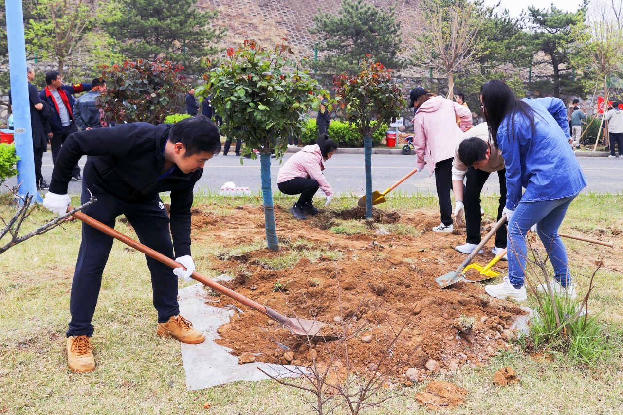 植树现场春意盎然、人头攒动,一派热火朝天的劳动景象。大家挥锹铲土,培土围堰,提桶浇水,种下元宝枫、油松、玉兰、树桩月季及连翘等树苗。在和煦的春风中,一株株新植树苗错落有致、生机勃勃。