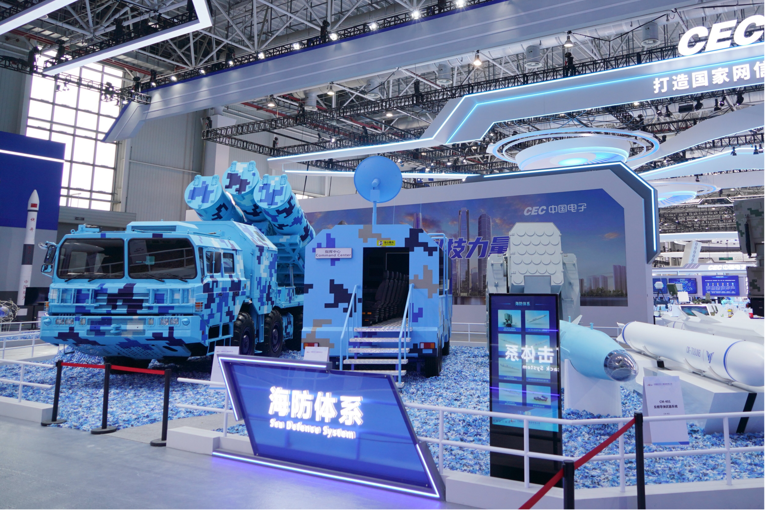 信息化条件下的现代战争不仅是武器系统之间的火力比拼,更是体系与体系的对抗。本次展出的海防体系由指挥控制系统、预警探测系统、火力打击、通信系统和保障系统组成,将各种高性能的海防利器通过信息化手段组成一个互联互通、相互配合的打击体系,能够提供远、中、近程全方位的对海防御解决方案。