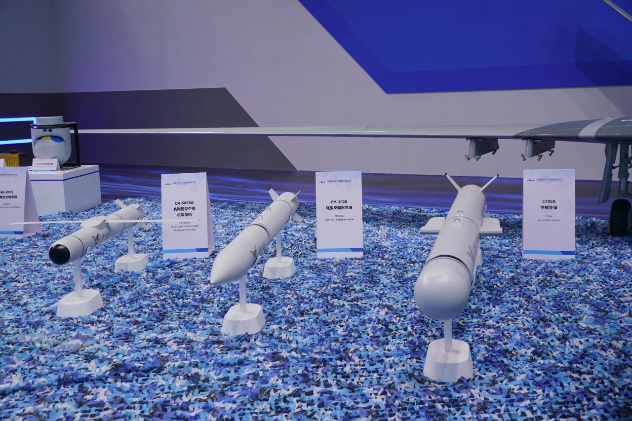 无人作战体系展出了种类丰富的机载弹药。典型战术目标打击方面,可挂载C705系列防区外导弹、CM-501系列导弹、CM-502系列导弹、CM-506KG弹药,对目标实施精确打击。