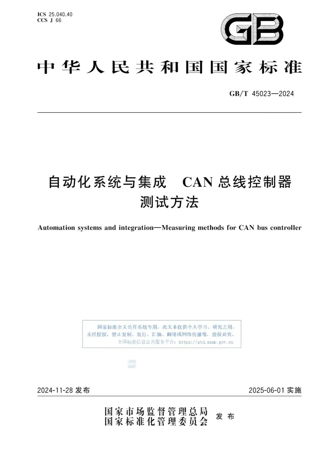 近日,由303所主持编制的《自动化系统与集成CAN总线控制器测试方法》国家标准已正式获批发布,标准号GB/T 45023-2024,将于2025年6月1日开始实施。