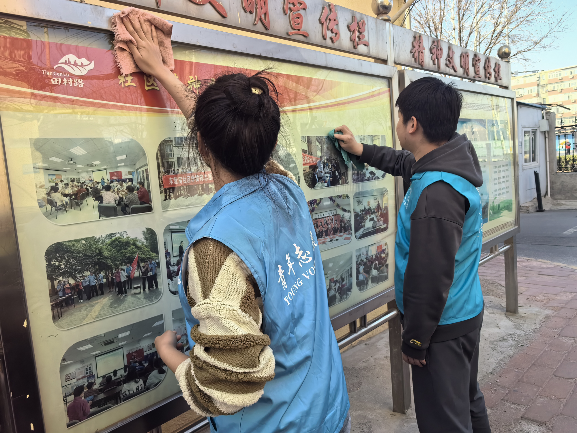 ▲8359所、磁电总体部青年对社区辖区内的健身器材、宣传栏、快递柜等公共区域进行全面清理,拂去冬日的尘埃、绽放春日的明媚。